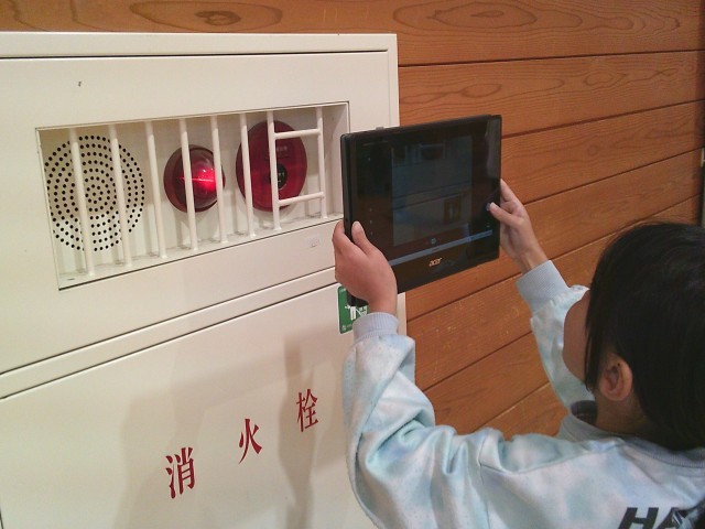 総合的な学習の時間では、「校内にある点字を探そう」という学習課題で、グループになって協力して探しました。「先生、こんなところに点字が貼ってあります」あるグループは、体育館の消火栓の場所に点字で作ったメッセージを見つけました。その他にも、いろいろなところに点字がありました。