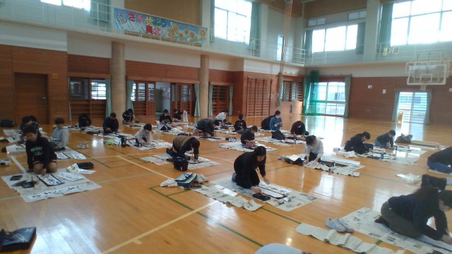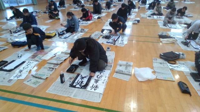 新年の書き初め大会に向けて、学年で練習を行いました。一字一字丁寧に真剣に書いていました。