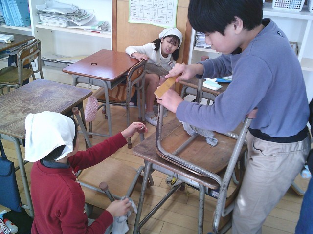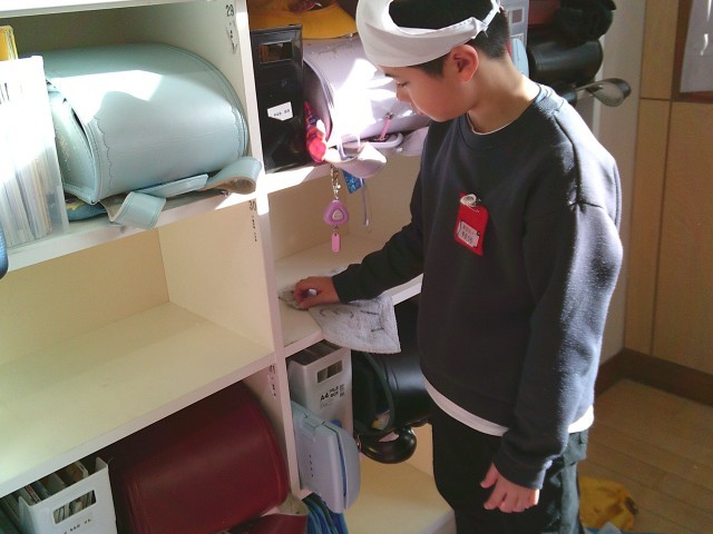 今日は、毎日使っている机や椅子、ロッカー等をきれいにしました。みんなで協力して教室やトイレの汚れもきれいに落としました。子供たちからは、「先生、雑巾が真っ黒になりました」「椅子の足のほこりが全部取れました」きれいになったところを見て嬉しそうでした。
