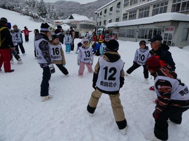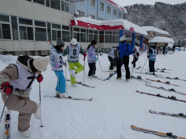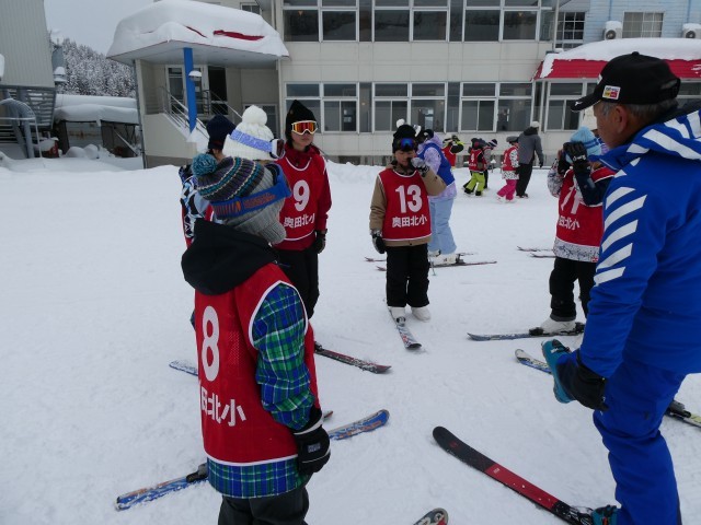準備運動を行い、技能に応じて練習を始めました。初めてスキーをする子供たちもたくさんいます。