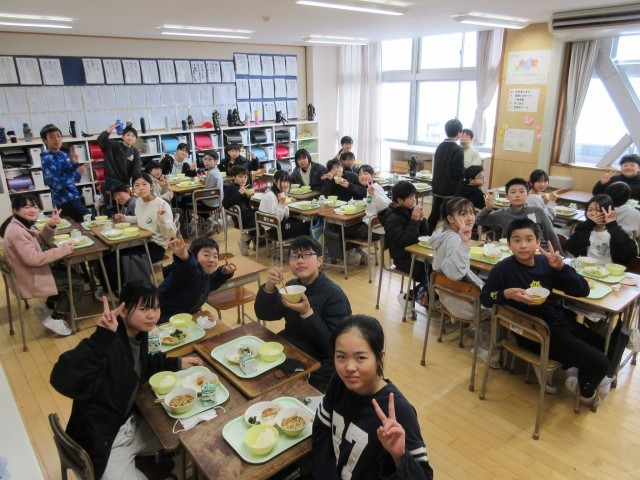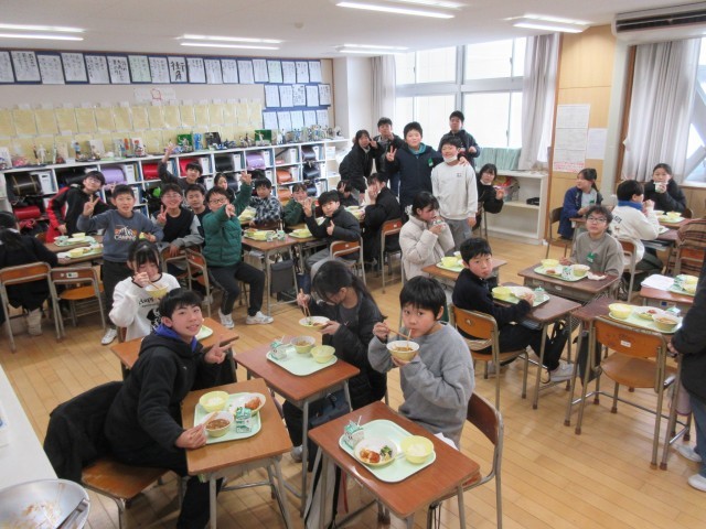 今日は、社会科「豊臣秀吉にまつわる献立」でした。特に、すり身やうどんが人気でした。写真は、6年教室の様子です。