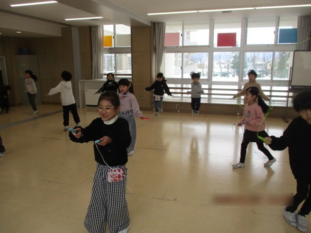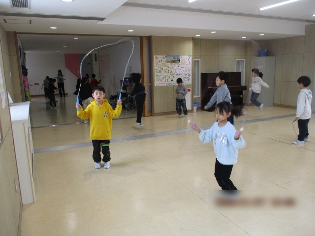 2月にある縄跳び大会に向けて、ぐんぐん運動の時間は、体育館と2階プレイルームに分かれて縄跳びの練習をしています。