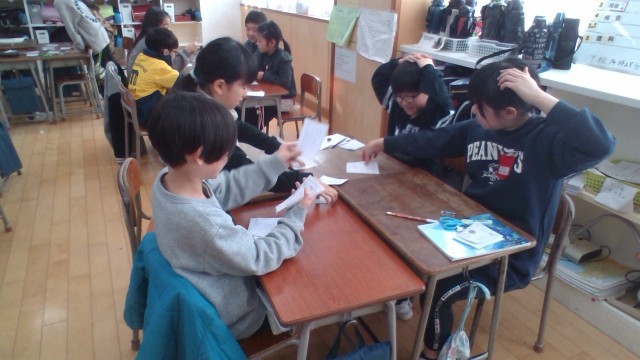 国語の時間に音訓かるたをつくりました。つくったかるたをグループで取り組みました。