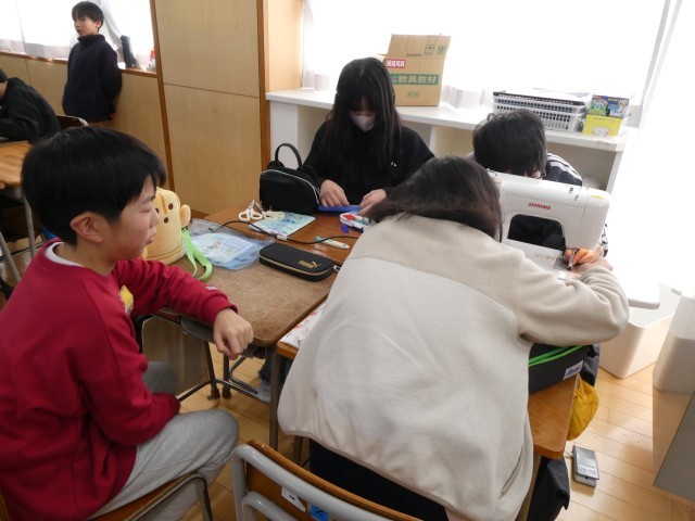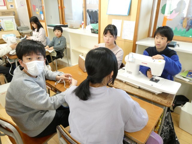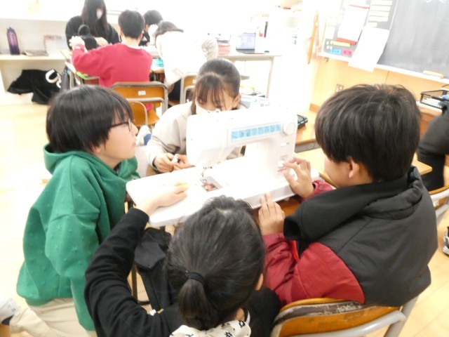 家庭科の時間に、エプロンを製作するためにミシンの使い方を練習しています。