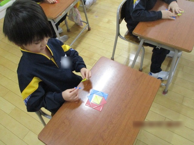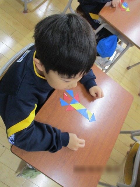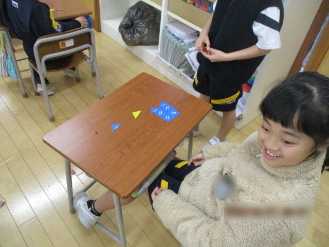 算数科の学習で、色板を使って形をつくる学習をしました。