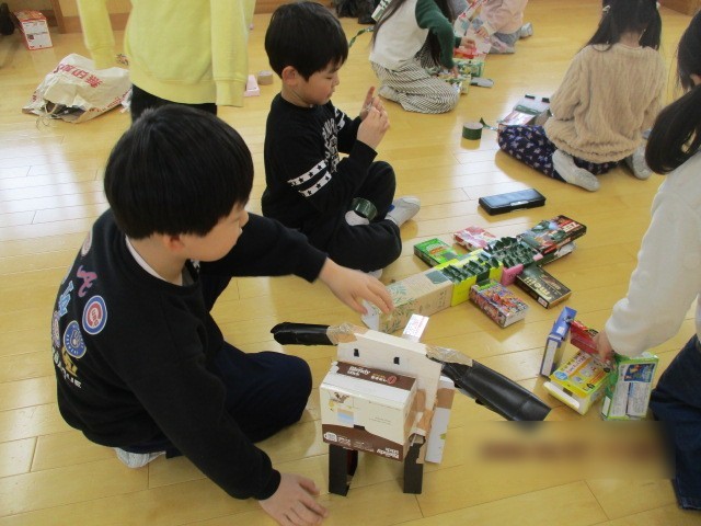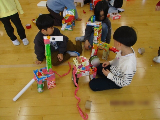 2学期からあつめていた空き箱で、動物等の生き物をつくりました。