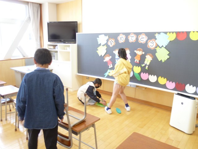 明日の入学式に向けて、5、6年生の子供たちが前日準備を行いました。