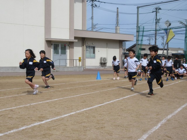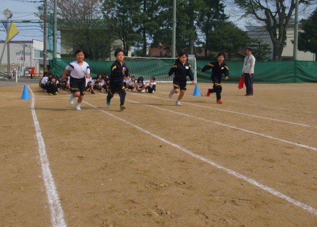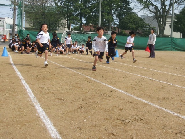 体育科の授業で、50m走のタイムを計測しました。太陽の光を浴びながら、元気よく走りました。