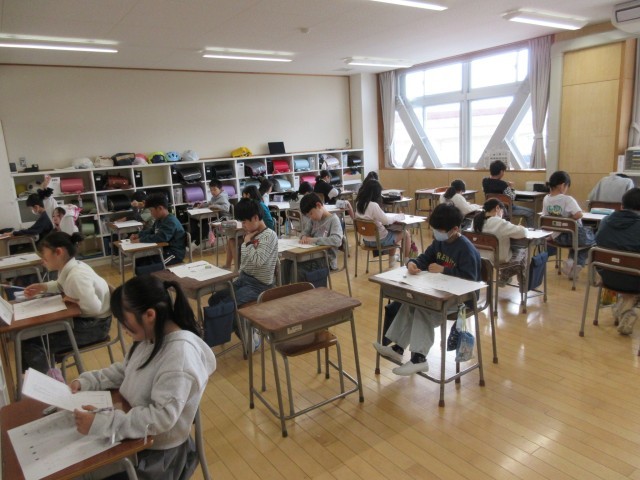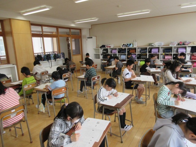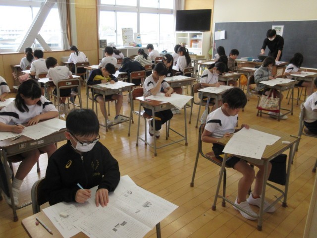 今日は国語です。初めての学力調査に、集中して取り組んでいます。