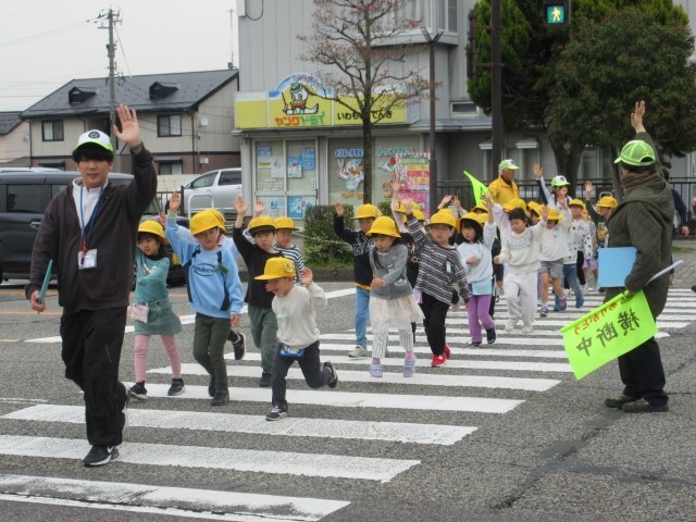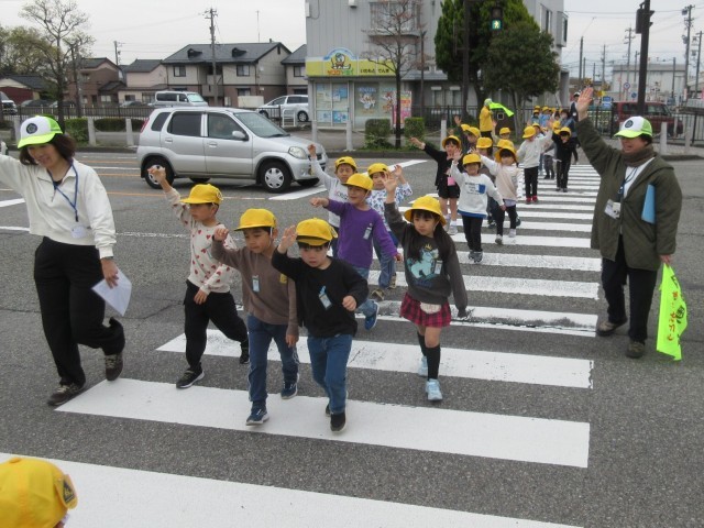 今日は、集団で交通安全に気を付けながら歩きました。これからは、一人で歩くときでも交通ルールを守り、事故にあわないようにしてくださいね。