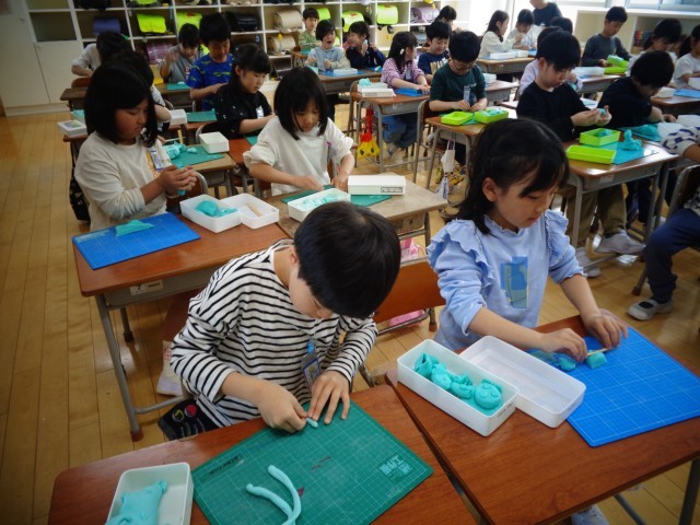 図工でねん土の学習をしました。にぎったり、こねたりしてねん土の感触を楽しみました。