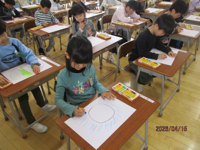図画工作科の学習では、自分だけのオリジナルの太陽を描きました。