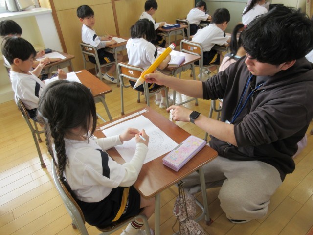 1年生は、鉛筆を使って運筆練習に取り組んでいます。くねくね、ぐるぐるなどの線をなぞります。