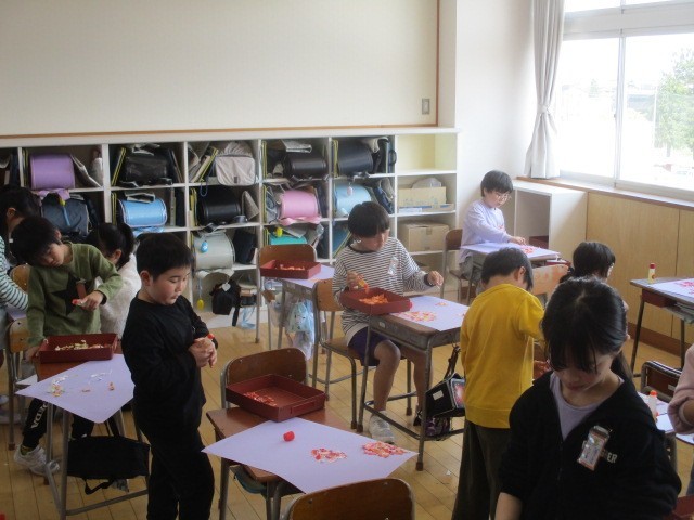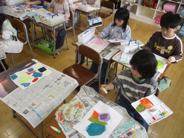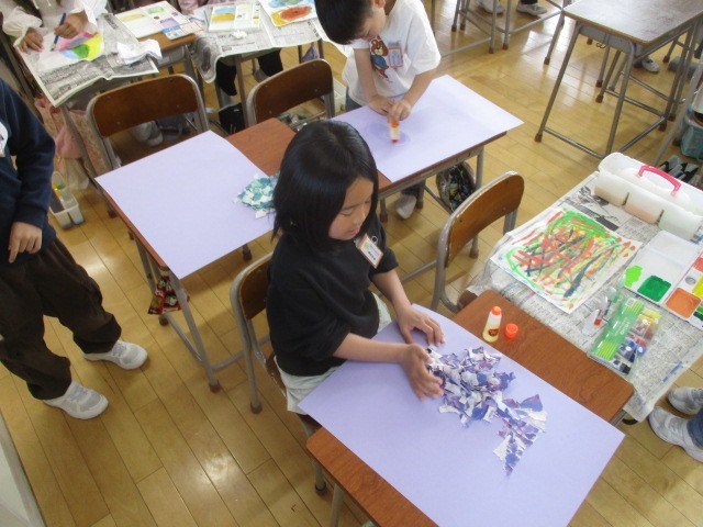 図画工作科では、書道半紙に水彩で色をつけ、思い思いの形にちぎり、コラージュを用いておいしい実がなる木を制作しています。