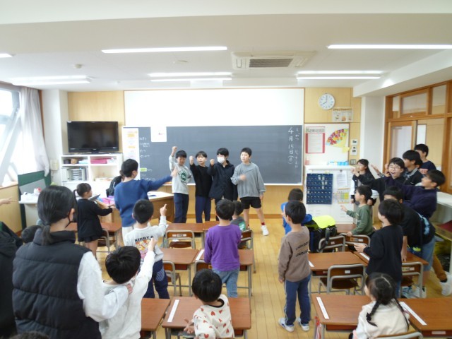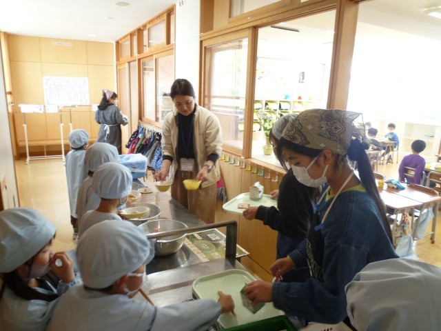 朝、登校してすぐに1年生教室へ行って身支度の手伝いをしたり、給食時間には配膳や片付けの手伝いをしてくれています。