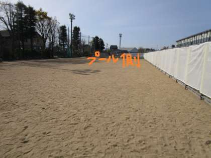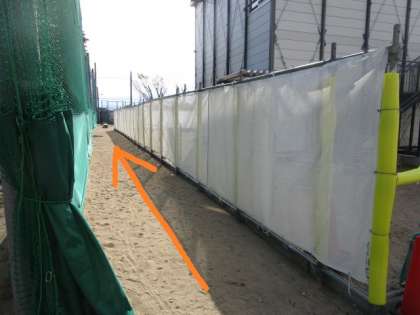 仮設(プレハブ)校舎の解体に向けて「壁」ができ、グラウンドがさらに狭くなりました・・・