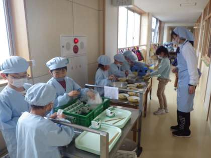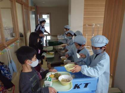 2年生からは、食缶(味噌汁や煮物)も自分たちで配膳しています。慣れないことにも、どんどんチャレンジしています。