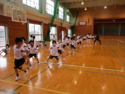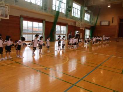 今日の体育は 横跳びやスキップ、「いちについて・・・どん!」の練習をしました。