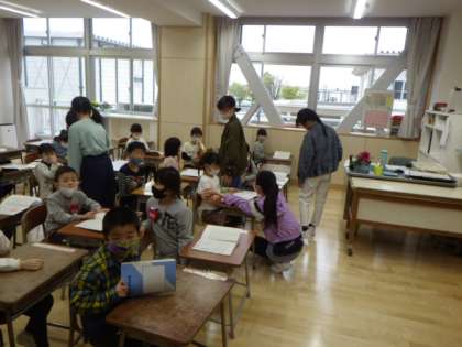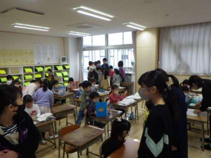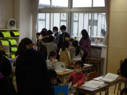 学習参観を楽しみに待つ1年生と、今日も笑顔で挨拶を交わしています。