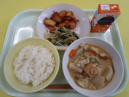 ・ごはん ・豚肉と大根のごまみそ煮 ・いかのかりん揚げ ・もやしのおひたし ・オレンジジュース