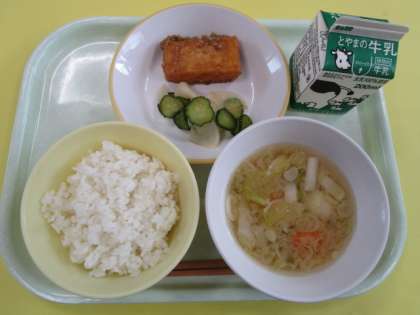 ・ごはん ・牛乳 ・揚げ出し豆腐のごまだれかけ ・かぶのレモン和え ・つみれ汁