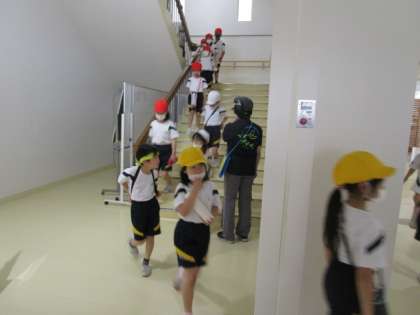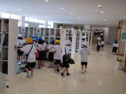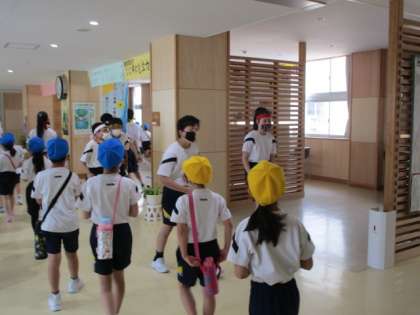 帰ってきた高学年と入れ違いで、低学年がサッカー広場に出発します。