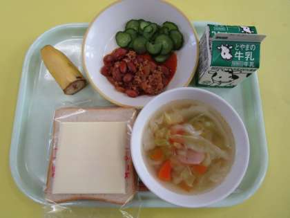 ・食パン ・牛乳 ・スライスチーズ ・きゅうりもみ ・チリコンカン ・バナナ