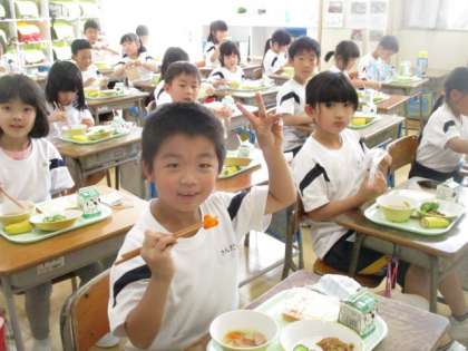 給食のスープの中に、ハートやくまの形をした「ラッキーにんじん」が入っていました。
