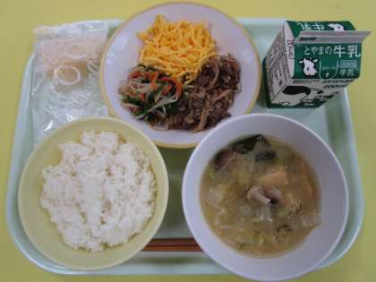・ごはん ・牛乳 ・ビビンバ(焼き肉、ナムル、錦糸卵) ・みそ汁 ・冷凍ラフランス