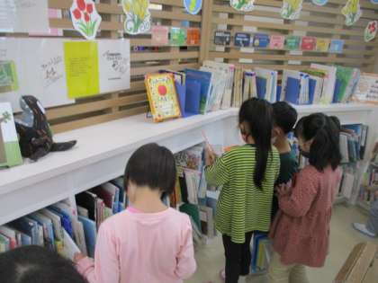今日は、図書室が使えたので、本を借りたいお友達と一緒に図書室へ行きました。