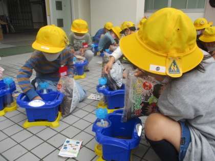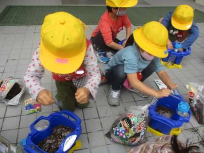 土に肥料を混ぜたり、土に穴を開けて種を植えたりしました。