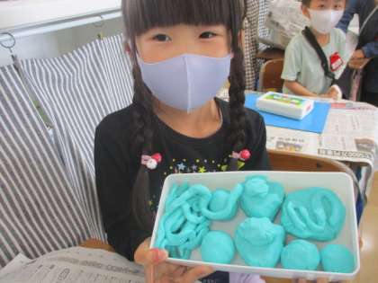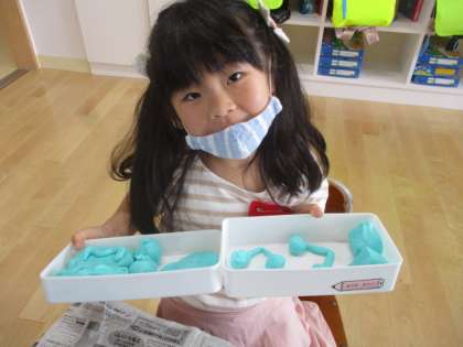 「さっき作った丸をつぶして、ハンバーグをつくったよ。」