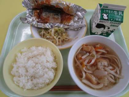 ・ごはん ・牛乳 ・かしわうどん ・さばの銀紙焼き ・甘酢和え