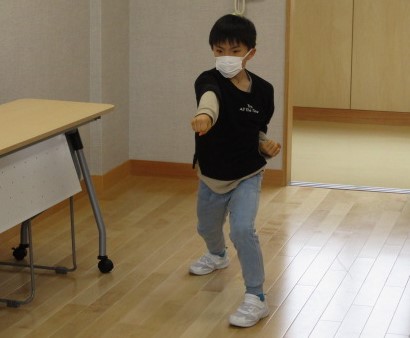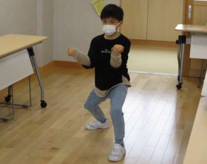 お昼休みに、小会議室で表彰式を行いました。表彰式に先立って、県大会で優勝した、空手の形の演技を披露してもらいました。