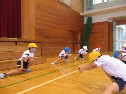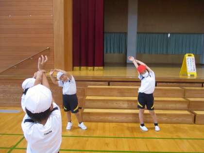 体育の時間の最初に、各クラスのスポーツ係が準備運動をしてくれます。