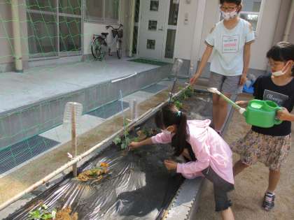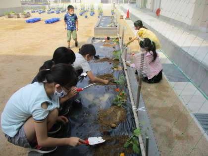 ヘチマの生長が早い苗を子供たちが花壇に植え替えました。