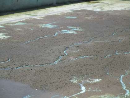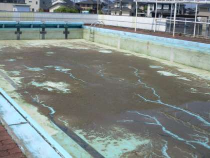 水を抜いたプール。2年間の汚れがびっしりとこびり付いていました。