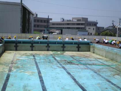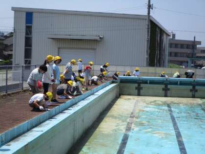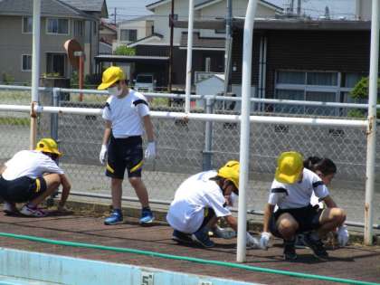 5年生が行います。プールサイドの除草が中心です。高学年としてがんばっています。午後からは、6年生がプール内をさらにきれいにします。