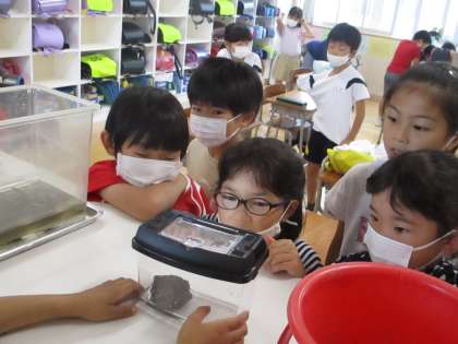 生活科で育てることになった「おたまじゃくし」の様子を観察しています。