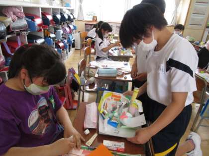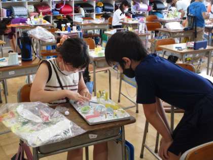 楽しい迷路ができ上がってきました。友達同士で作品を見合っています。