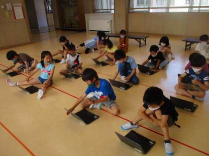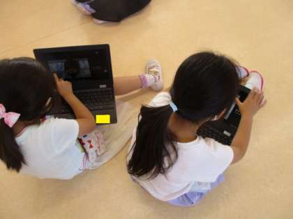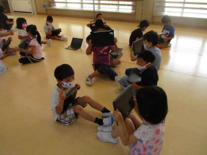 今日は、クロムブックを使って写真を撮ったり、撮った写真に絵を描き込んだりしました。