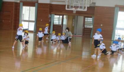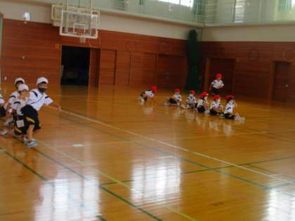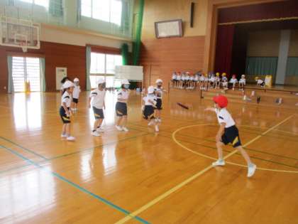 フリスビーを投げる練習をしてから、ドッチビーに取り組みました。