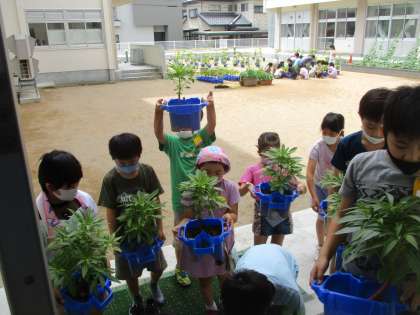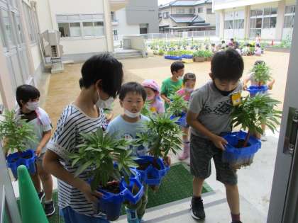 ホウセンカの鉢を児童玄関前へ移動しました。