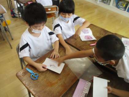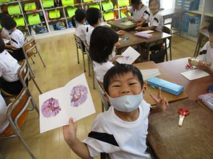 前回の取組を生かして、大きく色の濃い花を選んだことや、お友達のアドバイスのおかげで、前回よりも素敵なこすりだしになりました。