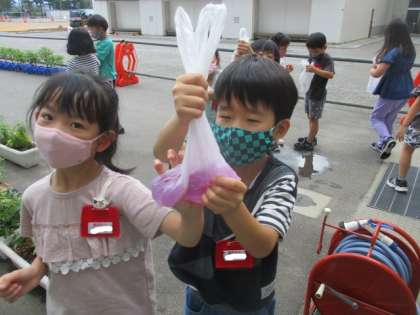 アサガオの花を揉んで、きれいな色水をつくって遊びました。