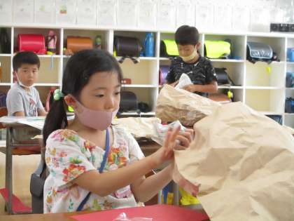 紙を手でくしゃくしゃにして、自分の作りたい「生きもの」の形を作りました!