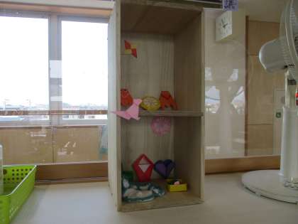 棚は、インテリア係が作った折り紙作品のディスプレイに使われています。