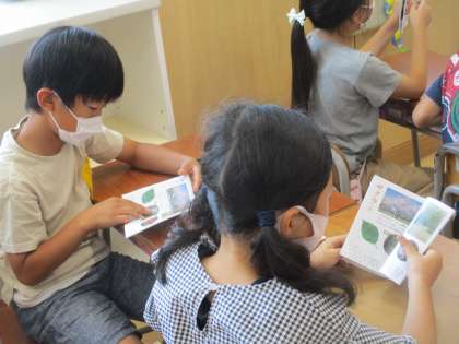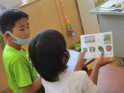 ミニミニ図鑑で木を調べています(3年生)