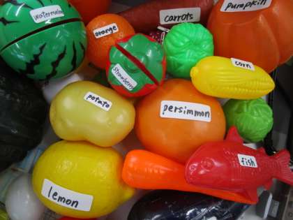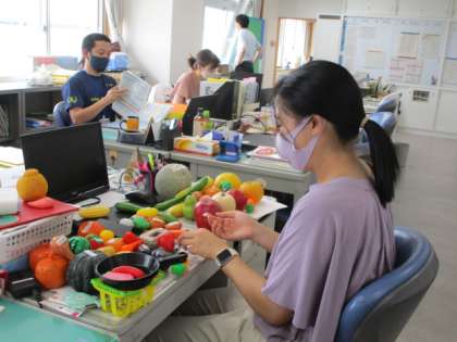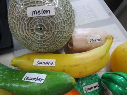英語では、果物や野菜を何というのでしょう。先生が、1つ1つのサンプルに「apple」や「pumpkin」などとシールを付けていました。2学期になったら、手にとって楽しみながら学んでくださいね。
