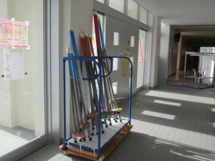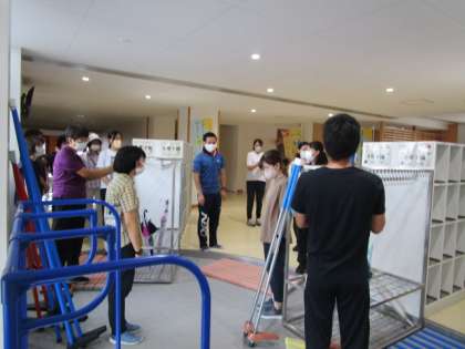 職員で竹馬や一輪車が使えるように準備しました。